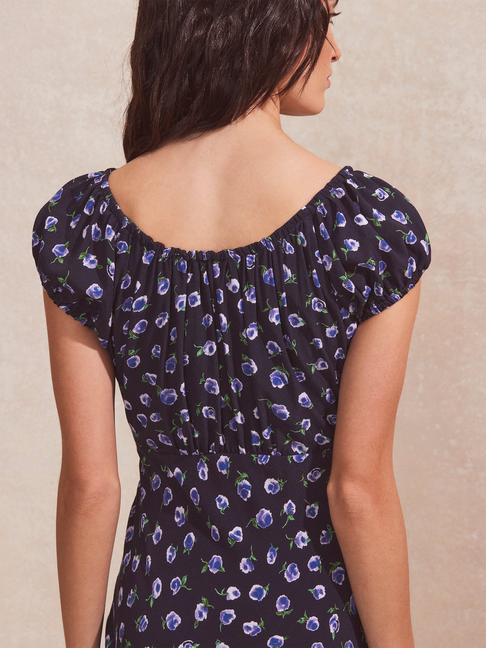 In navy with purple blossoms, this midi dress is made for spring ¨C and can be worn all summer, too. It is crafted from viscose-crepe and cut on the bias for the most flattering fit. We particularly love the gathered, scooped neckline ¨C detailed with a front tie ¨C and the gently puffed, capped sleeves. Style it with ballet flats, gold jewellery, and a basket bag.